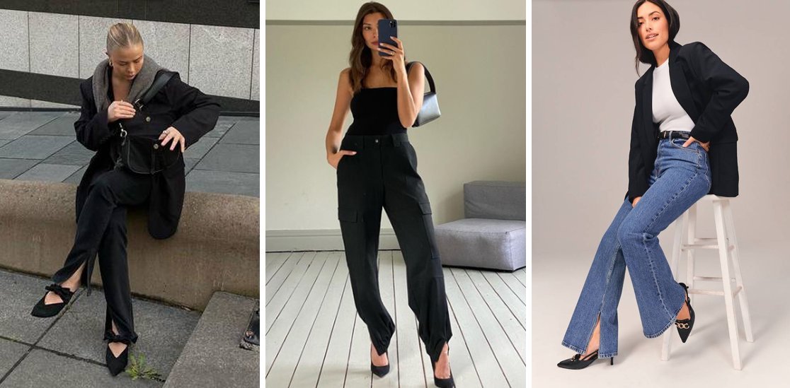 По боковым или шаговым швам, или в любом другом месте по линии низа. Наверное, этот тренд несёт в себе некоторую функциональность, например, в случае с puddle pants. И, лично моё мнение, такие разрезы визуально удлиняют ноги, в сочетании с умеренным клёшем от колена.
